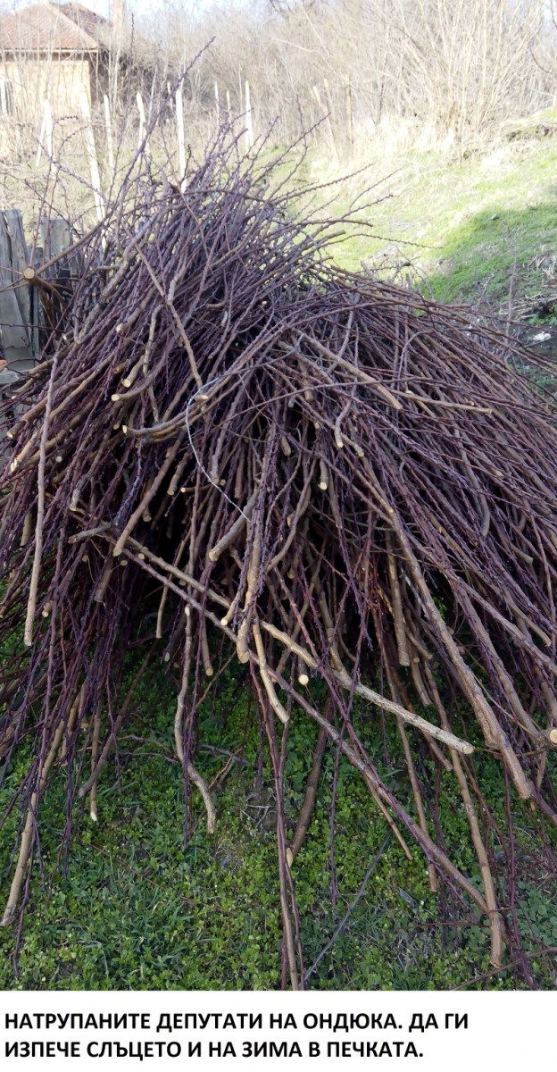 - Видя ли сеганку? Не е философия, к'ът твойте бумаги. Режеш сички депутати и подире да ги натрупаш ей на оня ондюк, до крушата (добре че каза до крушата, че не знам какво е ондюк). Лятоска ще иссъйнат и зъмъска ще се чупят като клечки, за печката ще ти требят, за друго депутатите не стават, да ги е.а в мамата! На, я режи ти сеганку.